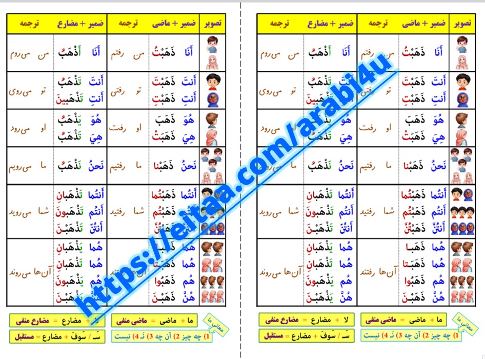 ۳) جدول رنگی ماضی و مضارع به شیوه فارسی (به صورت پی دی اف)